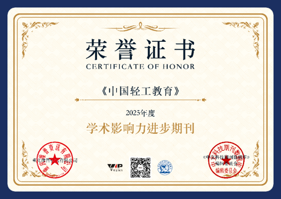 近日,维普资讯中文科技期刊数据库公布了2025年度期刊评选结果,我校主办的《中国轻工教育》和《造纸与纤维材料》两刊荣获“学术影响力进步期刊”奖。