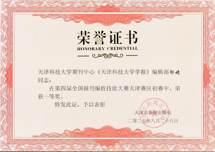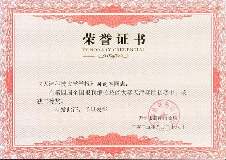 日前,第四届全国报刊编校技能大赛天津赛区比赛成绩揭晓。我校期刊中心郎婧、周建军分获一、二等奖,取得我校在该项赛事新的突破!这也是继2023年我校三位编辑荣获第三届全国报刊编校技能大赛(天津赛区)二等奖后,再获殊荣。 全国报刊编校技能大赛是由国家新闻出版署主办的专业技能竞赛,该赛事面向全国报纸、期刊出版单位的采编和校对人员,每两年举办一届。本届天津赛区比赛(初赛)于2025年7月29日在天津音乐学院举办,全市共有164名期刊编辑参赛,最终评选出一等奖5名,二等奖25名。